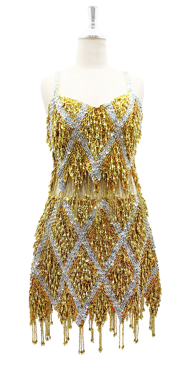 In-Stock Handmade Short Dress In Gold Hanging Beads and Silver Sequins.