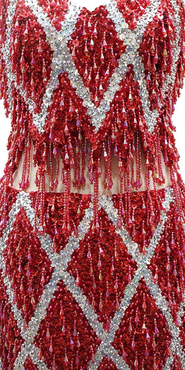 In-Stock Handmade Short Dress In Red Hanging Beads and Silver Sequins.