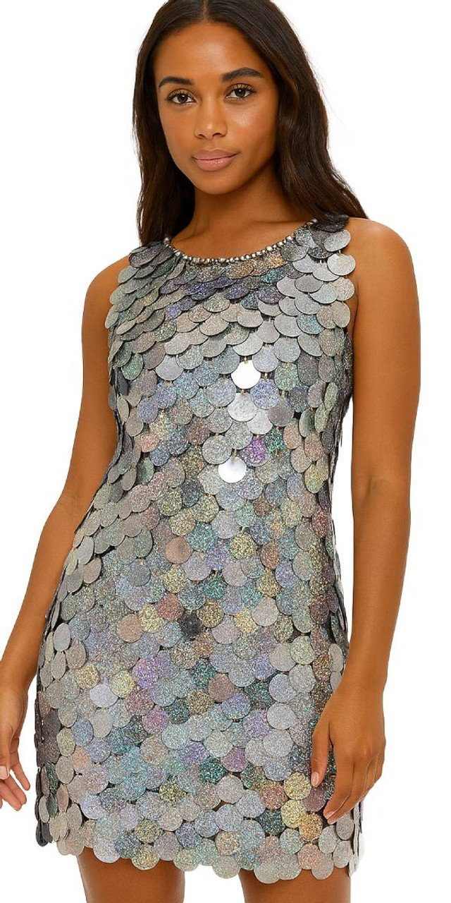 Short handmade sequin dress, in 30mm hologram silver paillette sequins