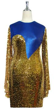 Add to Wish list Choose Options Golds Short patterned sleeved dress in gold sequin spangles fabric and blue stretch fabric $199.00 $149.00 Lining: yes Stretch: yes (1 to 2 inches across body) Composition: P.E.T. sequins on 95% polyester 5% spandex base Care: Cold water delicates or hand wash: test first. Dry flat. Do not iron. Order slightly larger if unsure, as you can adjust down in... Choose Options Add to Wish list