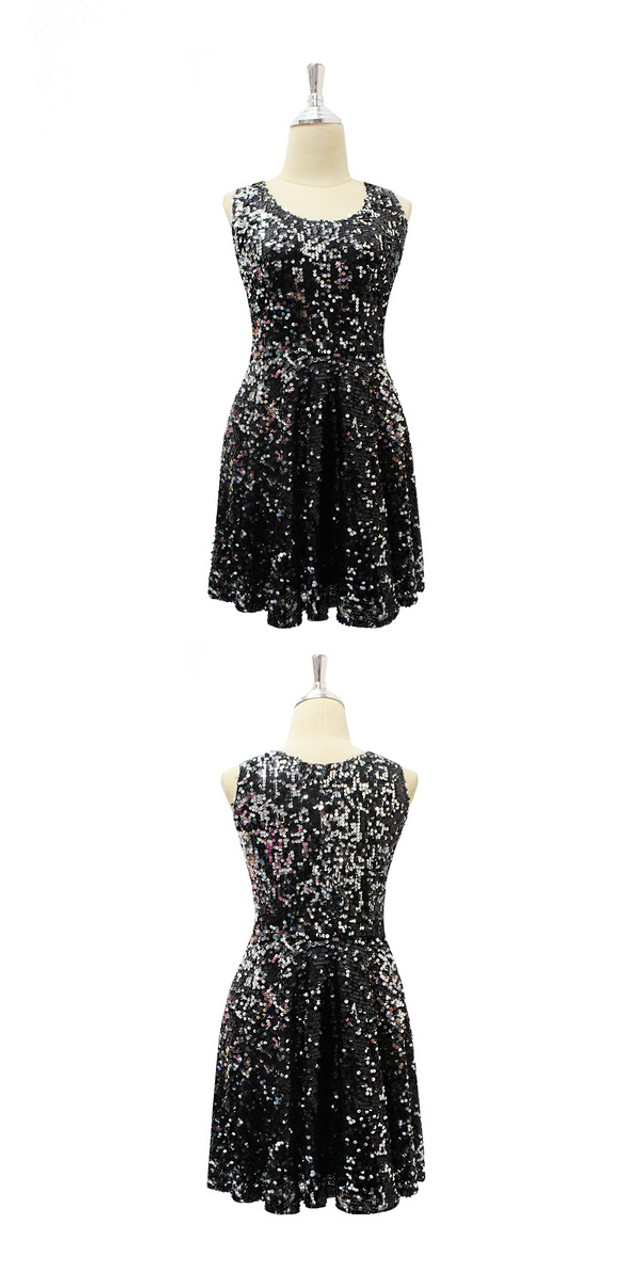This Duo Set has one short patterned dress in metallic turquoise and gold sequin fabric in a one-shoulder cut (SKU: #7002-085) & one short black sequin fabric dress (SKU: #7001-504).