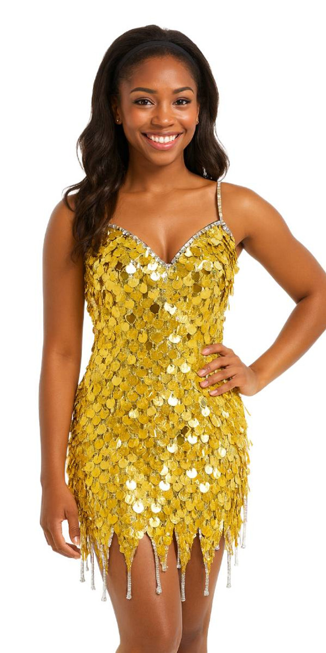 Short Handmade 20mm Paillette Hanging Hologram Gold Sequin Dress with Jagged, Beaded Hemline.