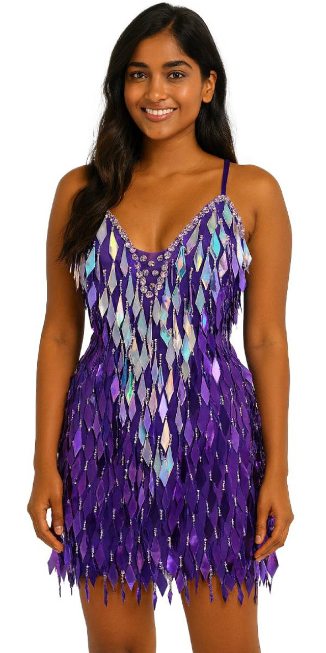 Short handmade sequin dress with diamond-shaped metallic silver and purple sequins